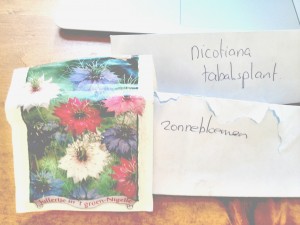 Zij zocht het braakliggende terrein uit en ik nam de zaadjes, handschoenen en water mee. De zaden had mijn moeder meegegeven en netjes op envelopjes geschreven wat de inhoud is.